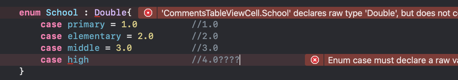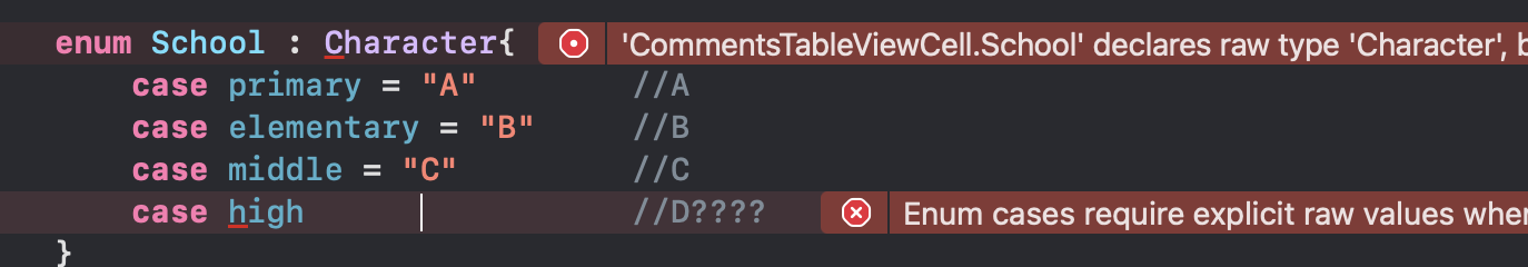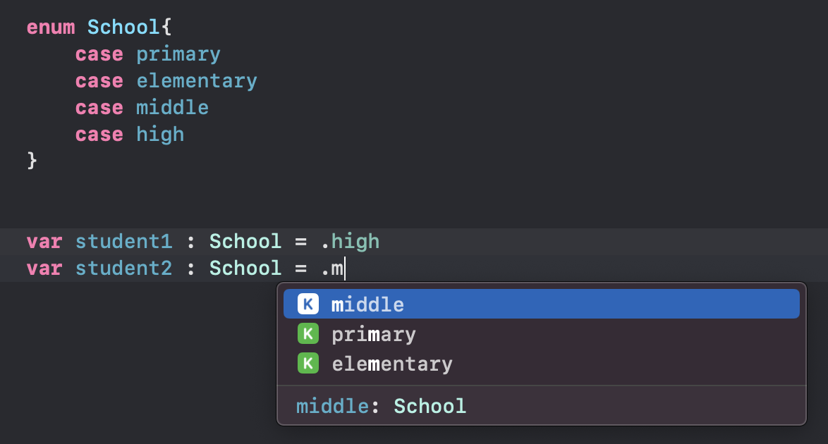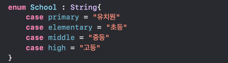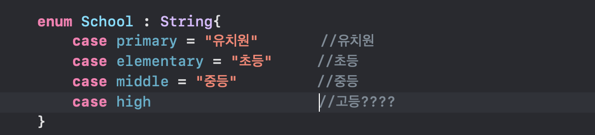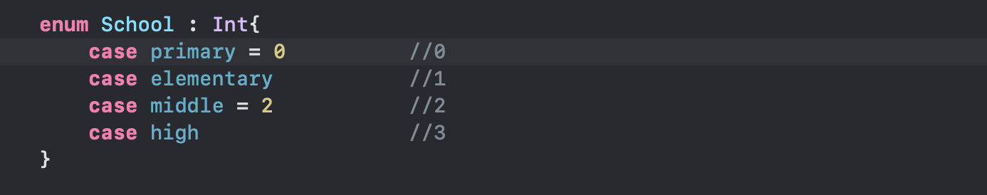 C언어나 Objective-C에서는 열거형이 생성될 때, 각 case별로 암시적인 정수값(ex) 0, 1, 2, 3)을 할당해주었는데,