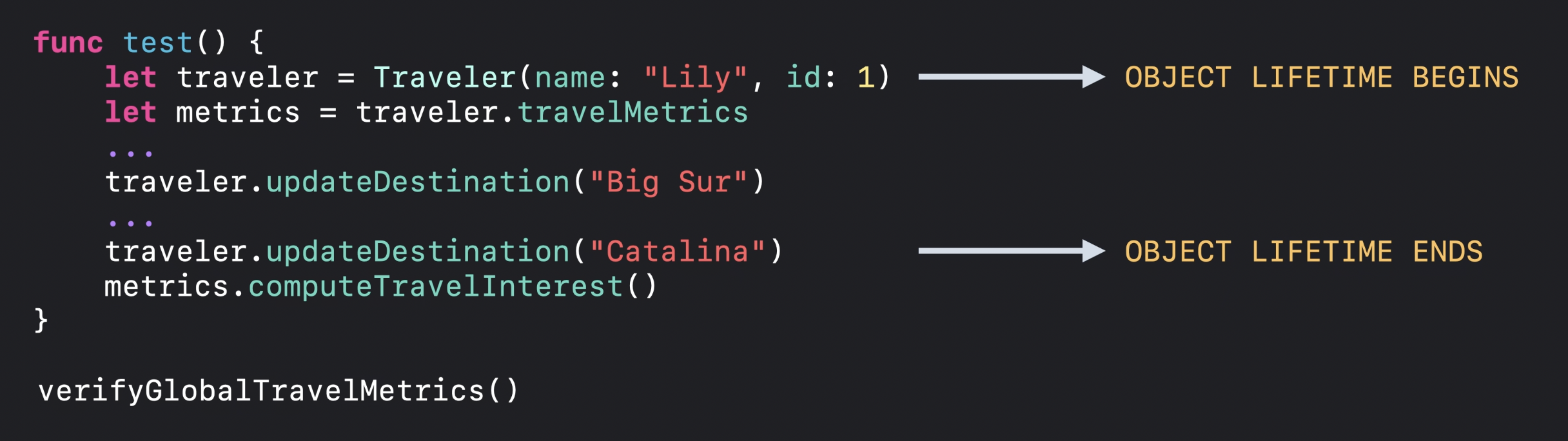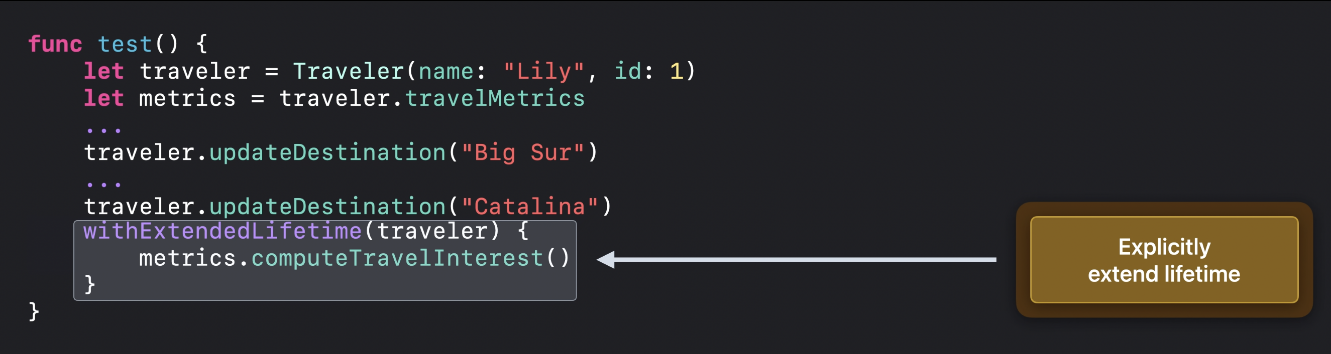 아까 배웠던 withExtendedLifetime() 을 사용하여 'Traveler' 객체의 수명을 연장시켜 해결하는 방법이 있다.