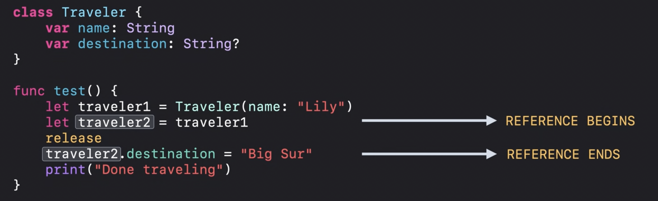컴파일러는 'traveler1' reference 가 마지막 사용되는 즉시, 'release' 오퍼레이션을 주입한다.
